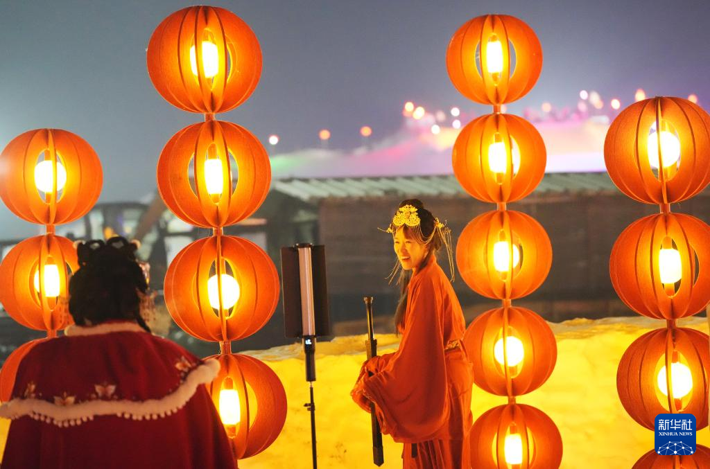 1月12日,在沈陽市沈北新區的稻夢小鎮,游客打卡拍照。