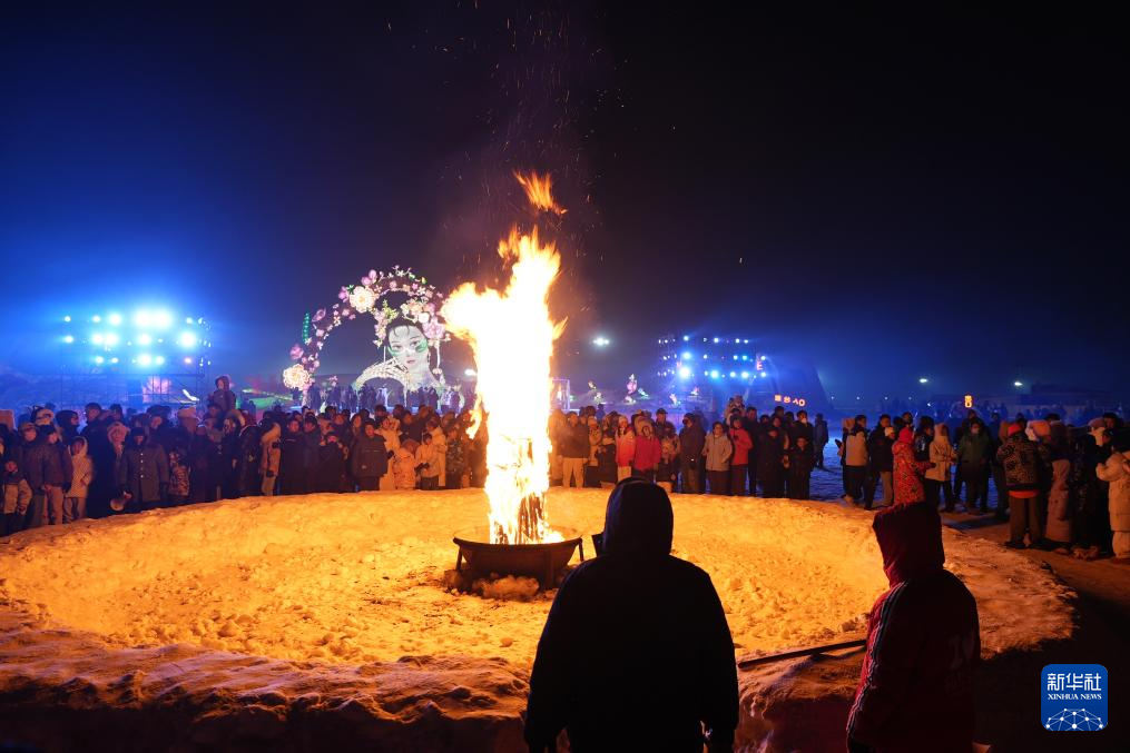 1月12日在沈陽市沈北新區的稻夢小鎮拍攝的篝火演出。