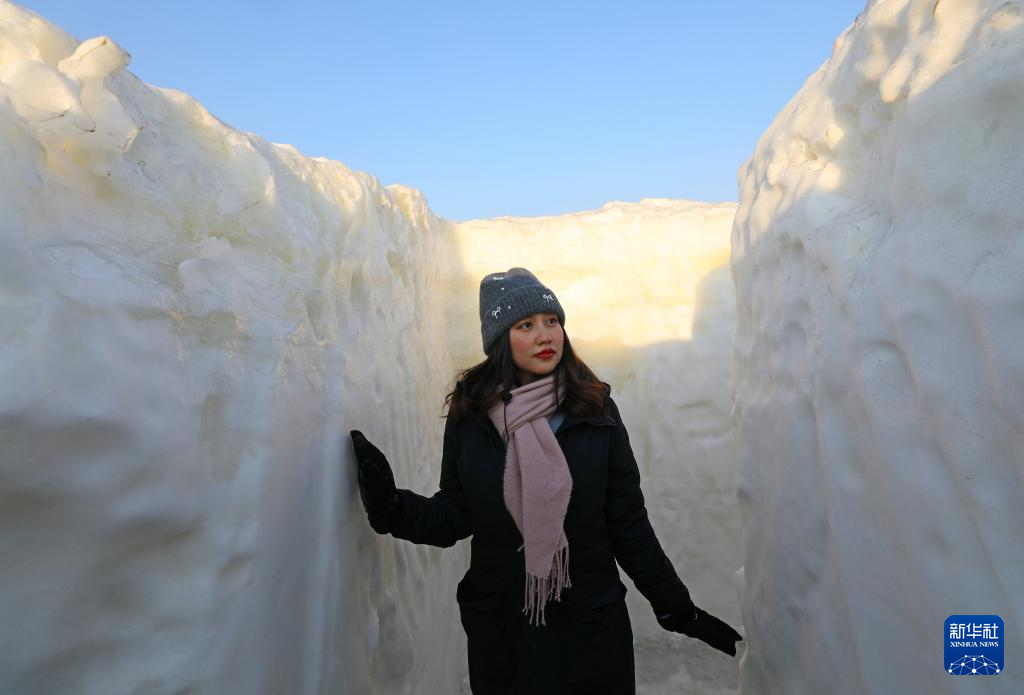 1月12日,在沈陽市沈北新區的稻夢小鎮,游客探訪雪地迷宮。