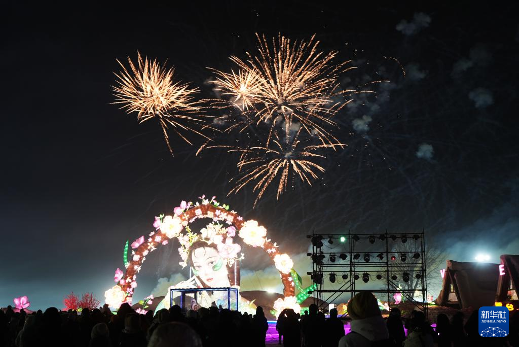 1月12日在沈陽市沈北新區的稻夢小鎮拍攝的煙火表演。