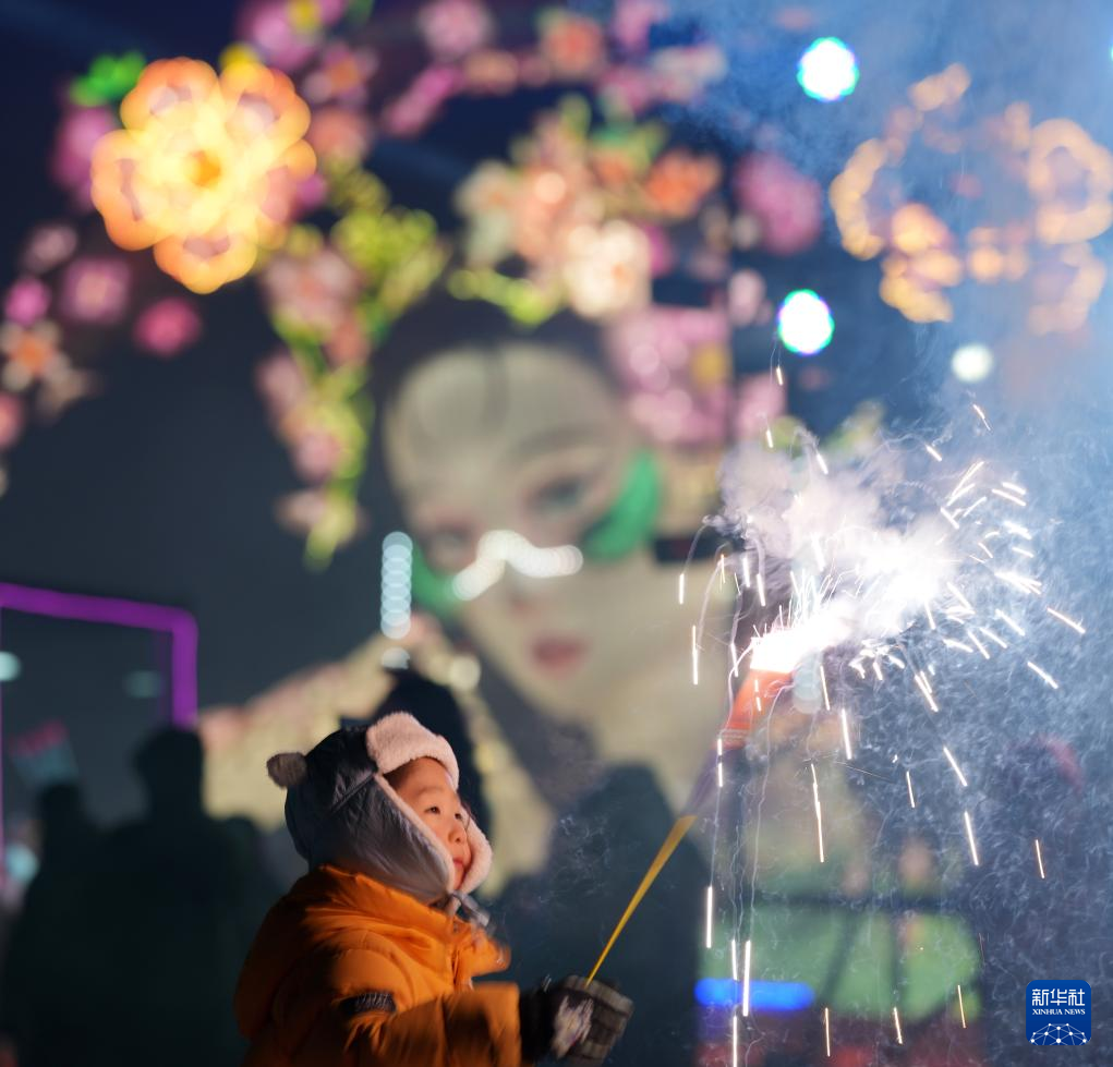 1月12日,在沈陽市沈北新區的稻夢小鎮,小游客放煙花。