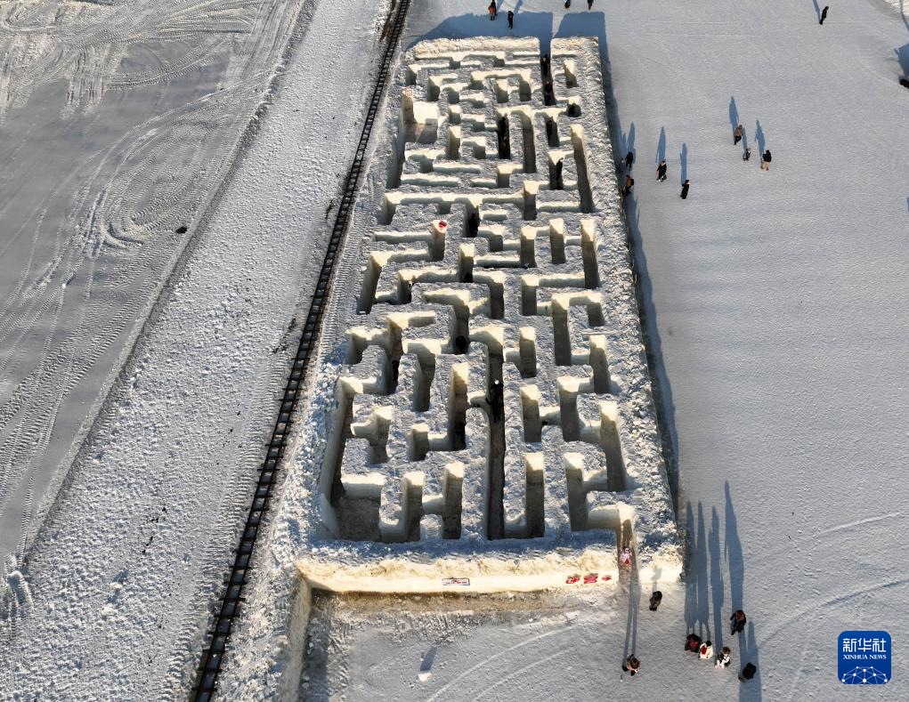 1月12日,在沈陽市沈北新區的稻夢小鎮,游客打卡雪地迷宮(無人機照片)。