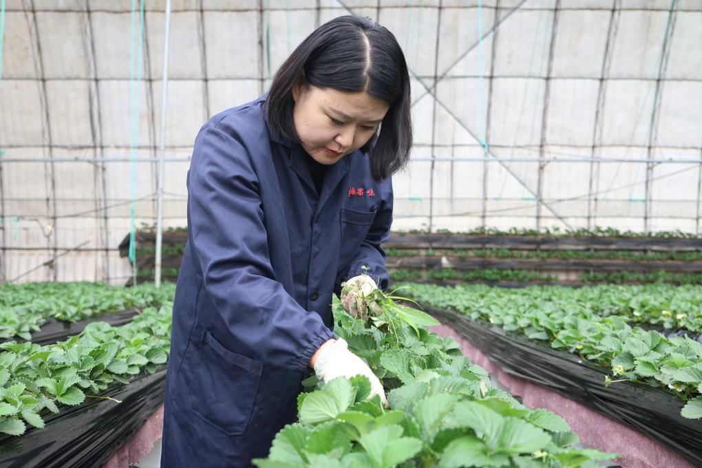 在遼寧東港市椅圈鎮德祥村,返鄉大學生張曉林正在大棚內查看草莓長勢。(受訪者供圖)