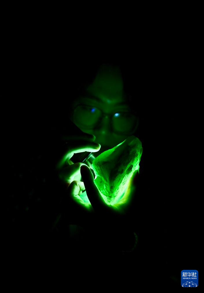 5月30日,唐校在“玉三生”工作室內查看岫玉原料紋理。