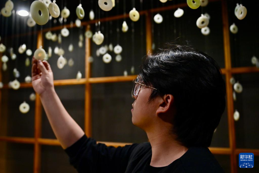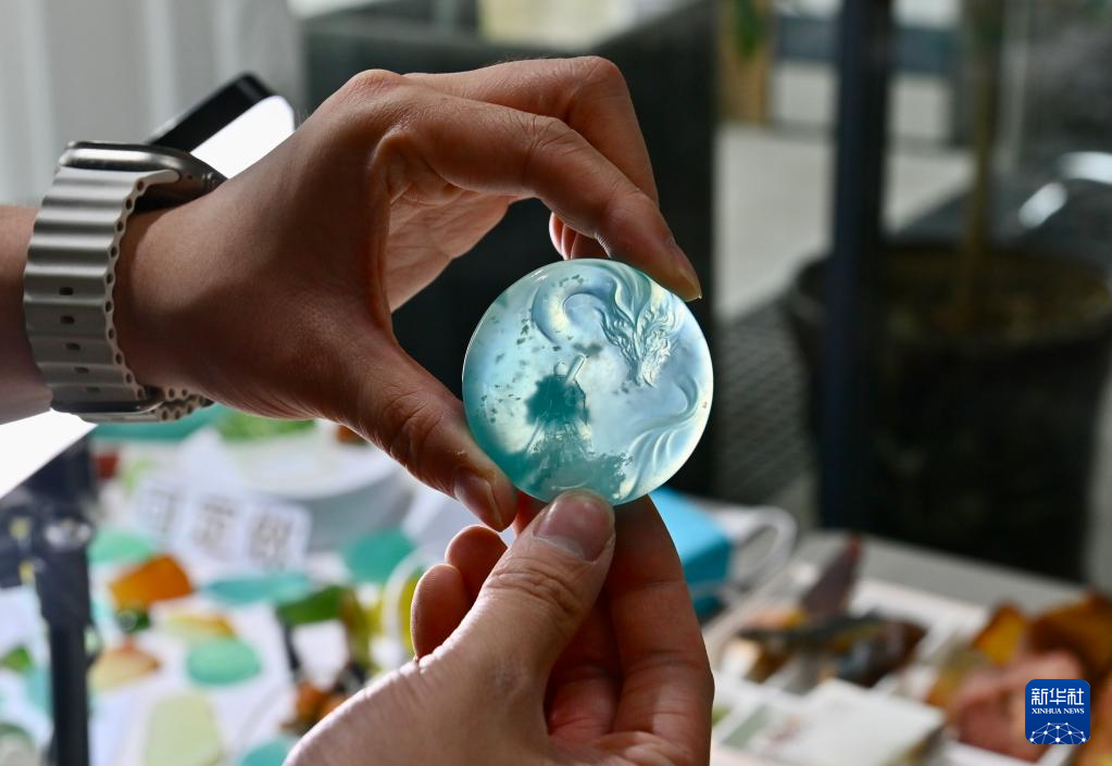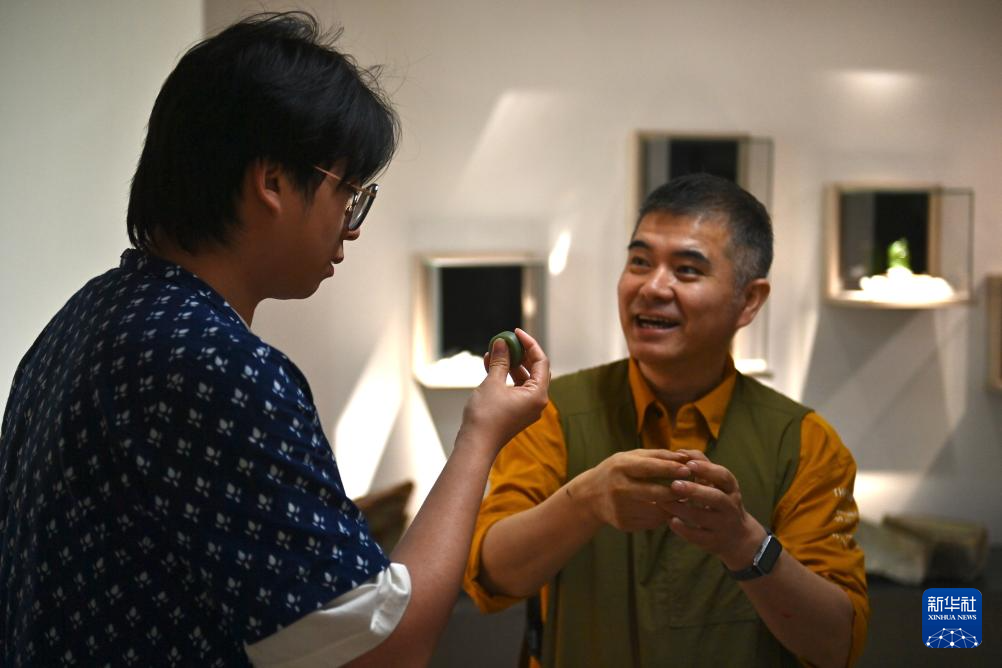 5月20日,唐校在“玉三生”工作室內展示一件融合了國潮元素的岫玉作品。