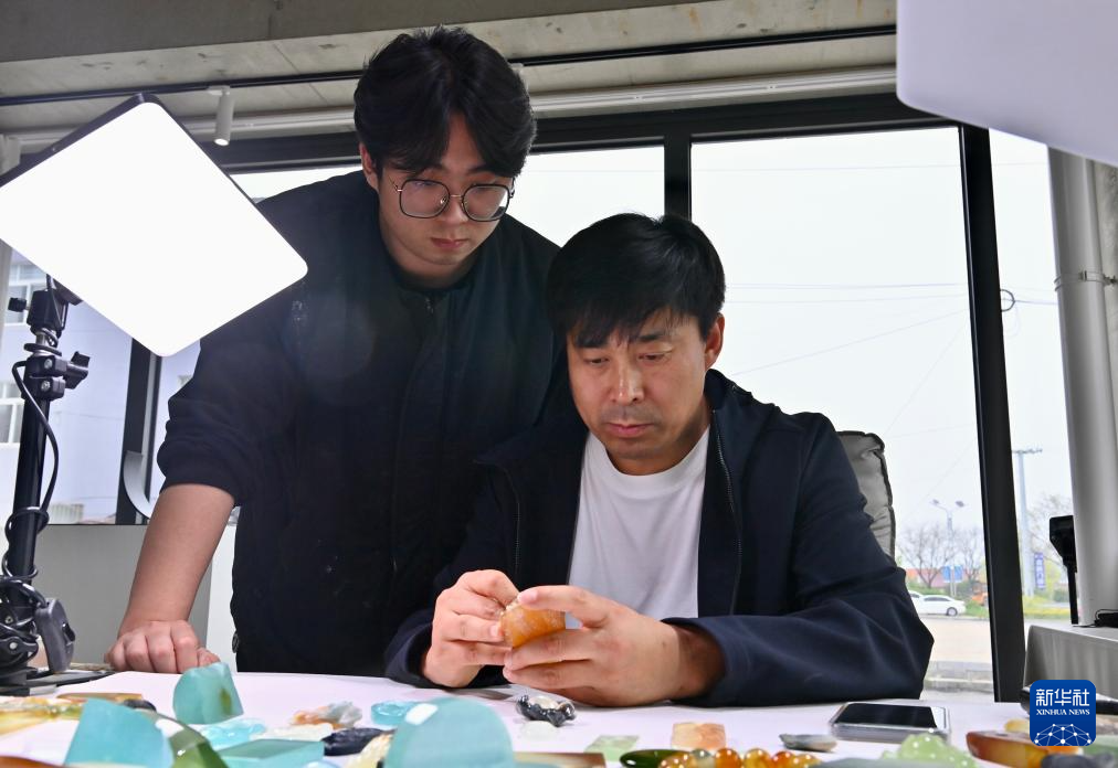 5月20日,唐校(左)和父親唐帥在“玉三生”工作室內切磋岫玉雕刻技藝。
