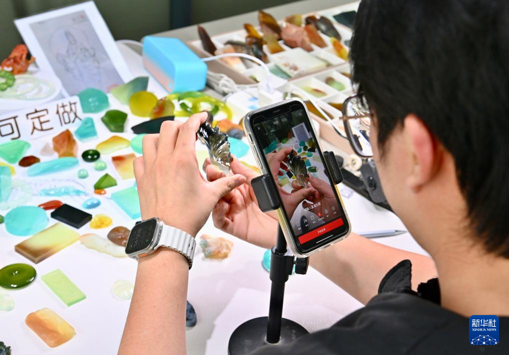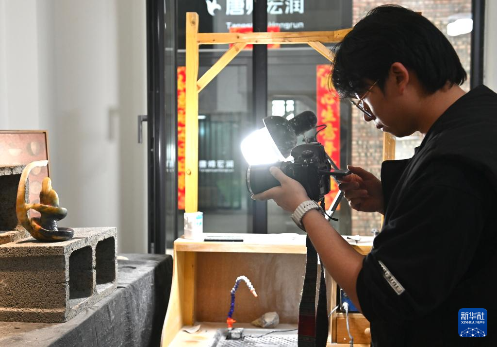 5月20日,唐校在“玉三生”工作室內拍攝岫玉作品,為客戶展示制作進度。