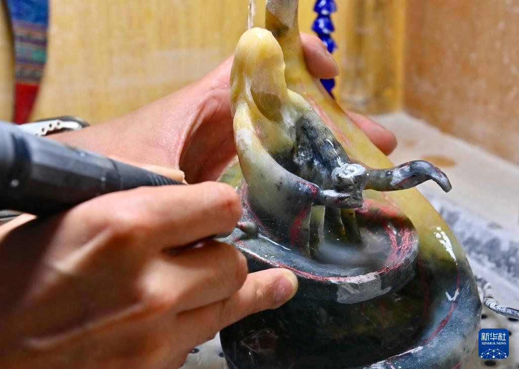 5月20日,玉雕師在“玉三生”工作室內加工岫玉作品。