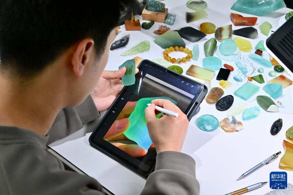 5月20日,雕刻師在“玉三生”工作室內繪制岫玉加工圖稿。