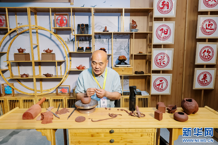 圖為在遼寧省文體旅融合發展交流展示活動中的朝陽館,工作人員展示紫陶制作技藝。新華網發