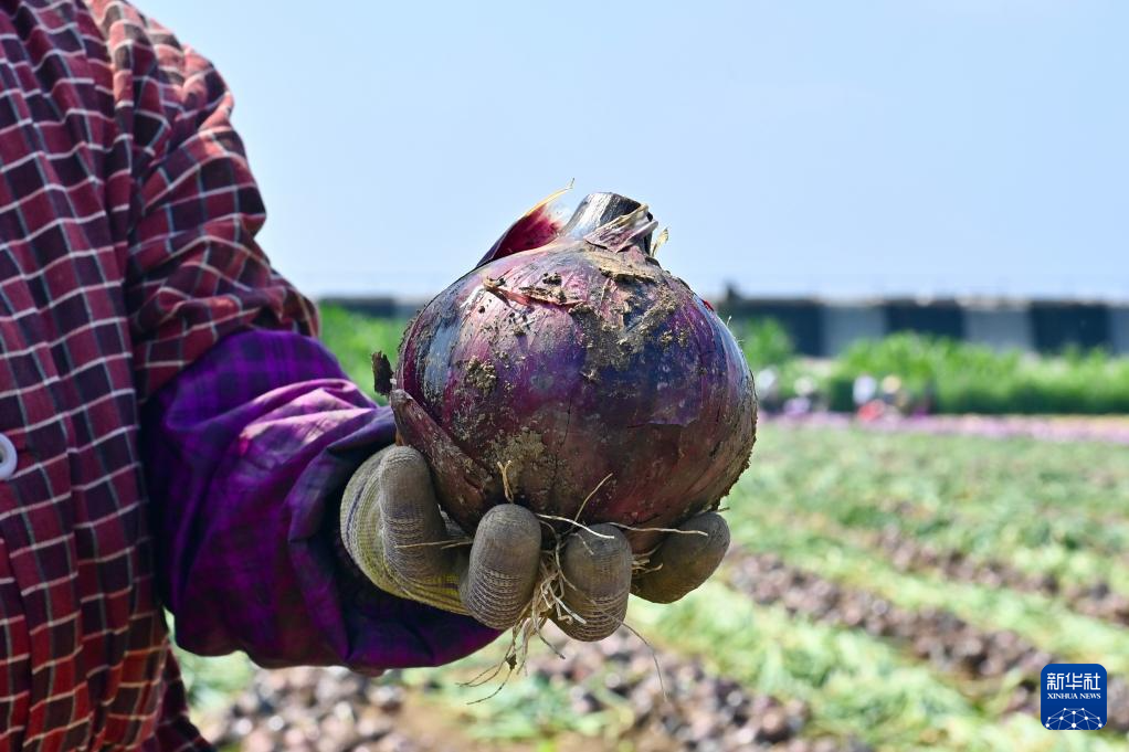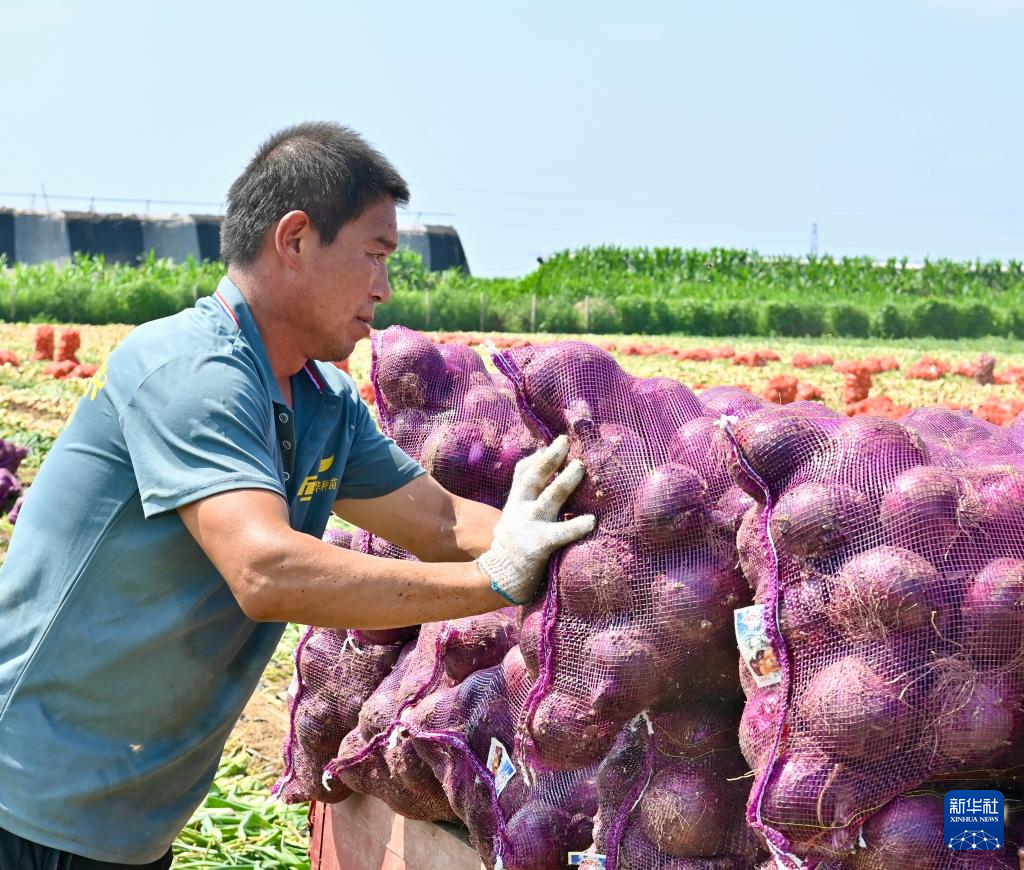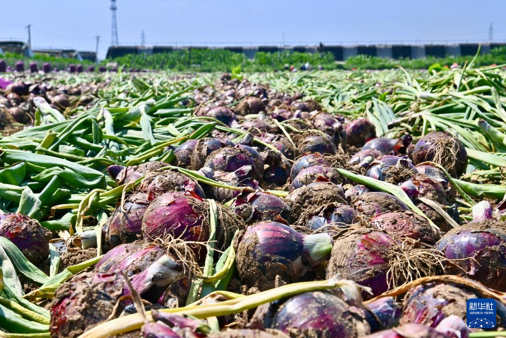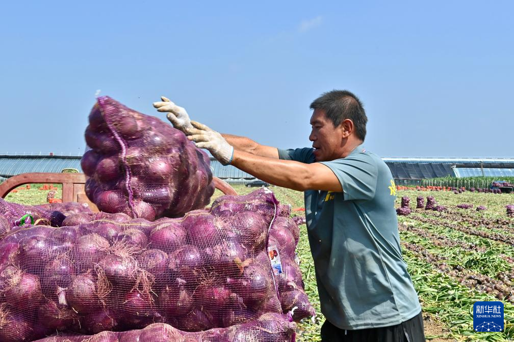 近日,遼寧省鞍山市海城市望臺鎮瑞亞蔬菜農民專業合作社的圓蔥迎來豐收。農戶們打包、裝車,田間地頭一片繁忙景象。