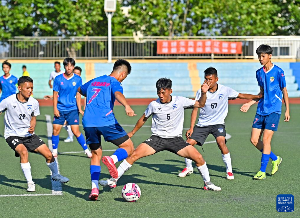 7月14日,在大連育明高中,大連和那曲兩地少年在一場足球友誼賽中拼搶。新華社記者 周華 攝