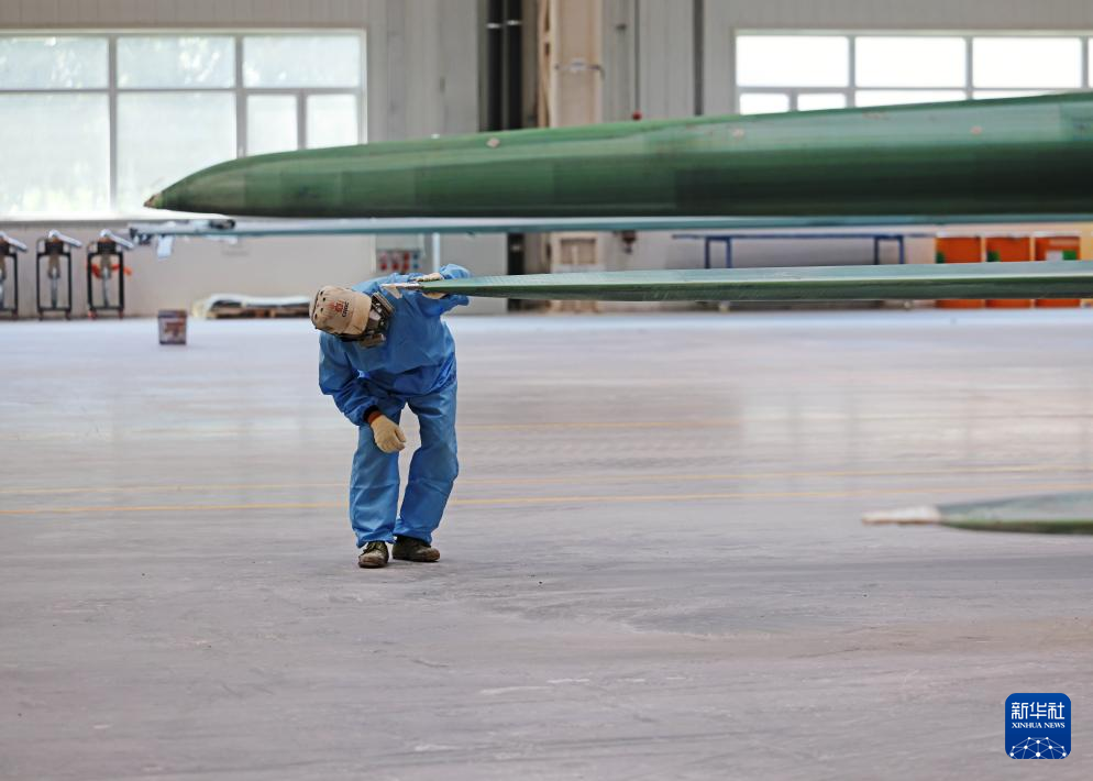 7月30日,在鐵嶺明陽新能源有限公司車間,工人在加工風力發電機葉片。