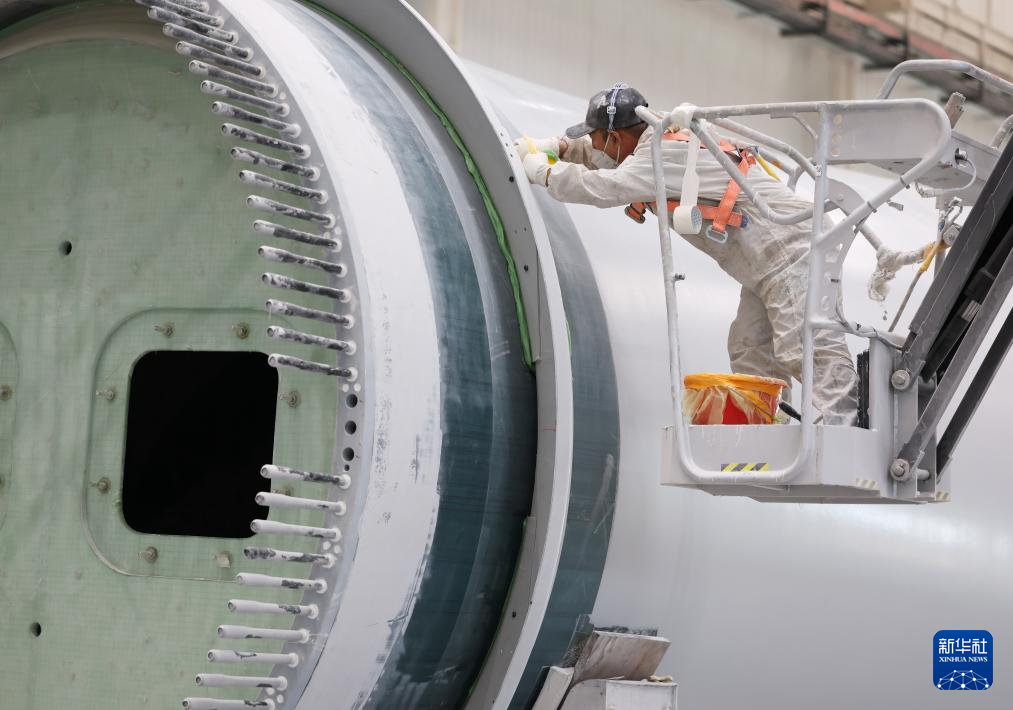 7月30日,在鐵嶺明陽新能源有限公司車間,工人在檢查風力發電機葉片質量。