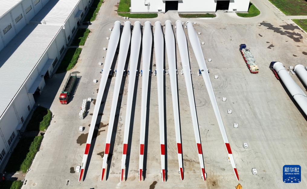 7月30日在鐵嶺明陽新能源有限公司拍攝的風力發電機葉片(無人機照片)。