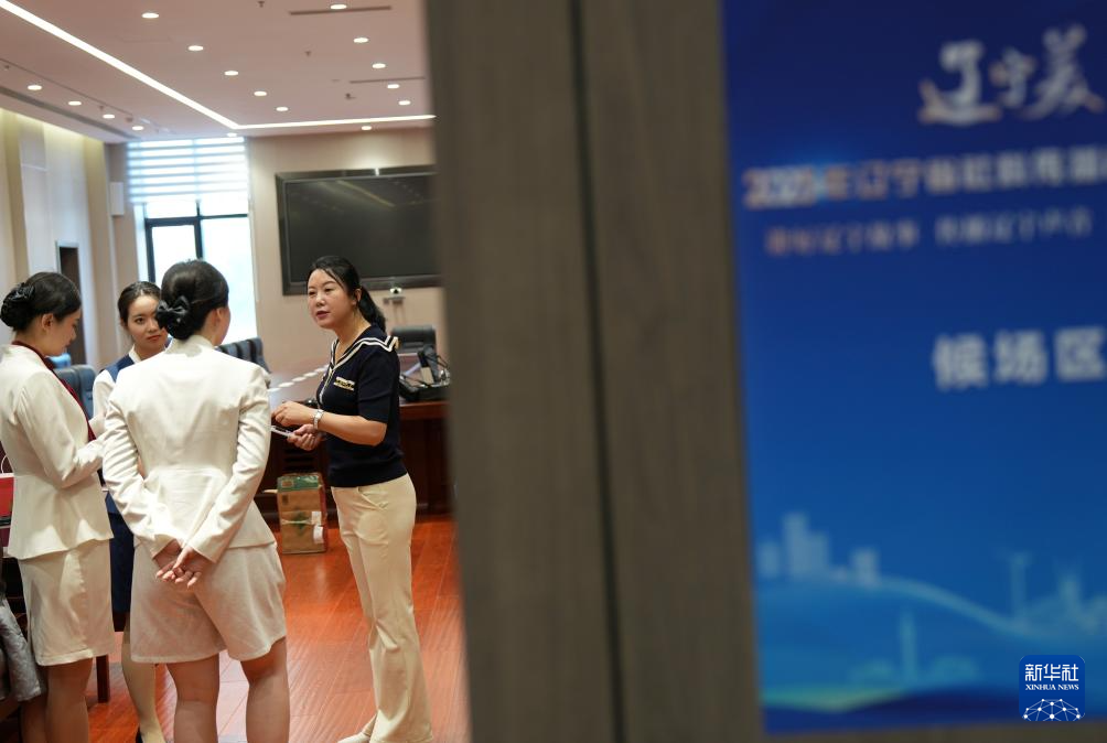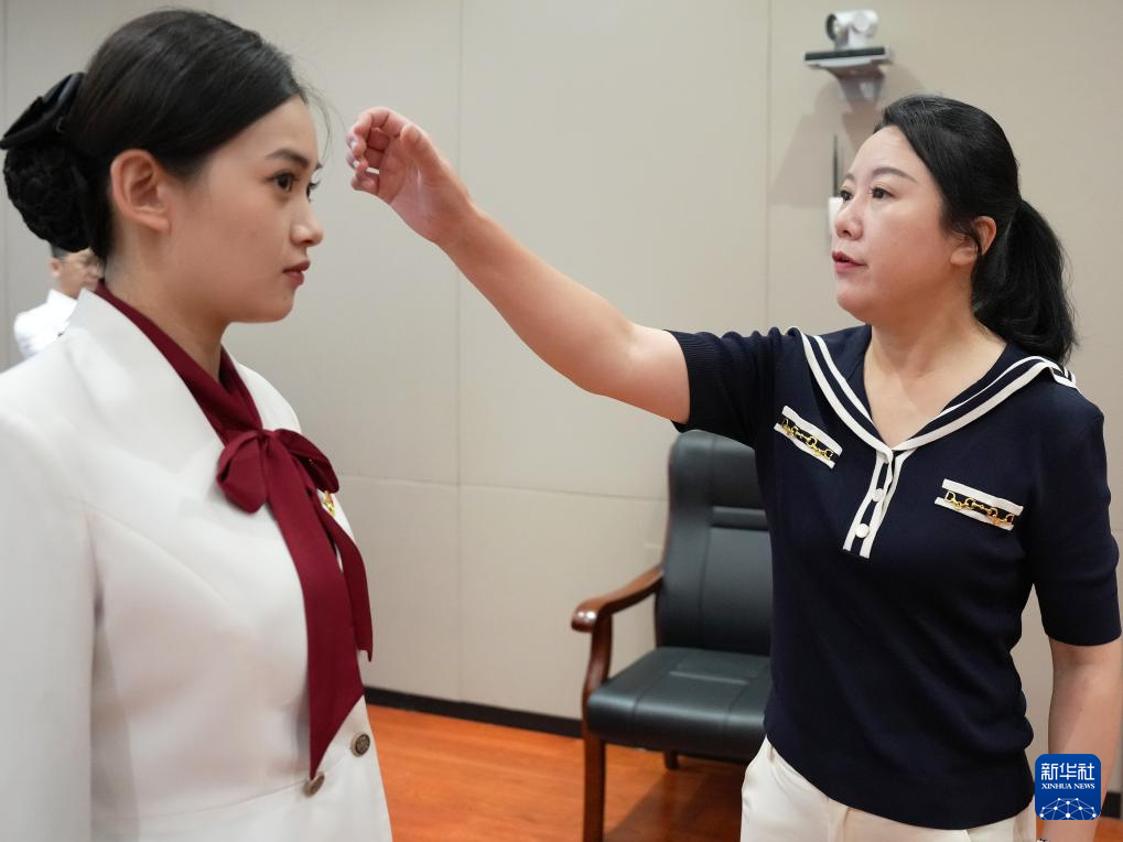 7月22日,在沈陽市大東區新時代文明實踐中心,石任華(右)在后臺幫助同事整理著裝和儀容。