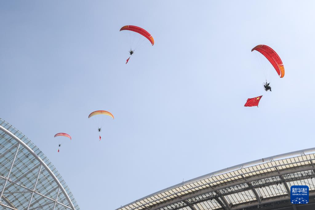 8月10日,開幕式現場升起國旗與會旗。