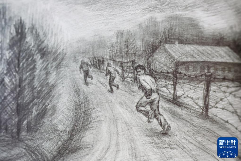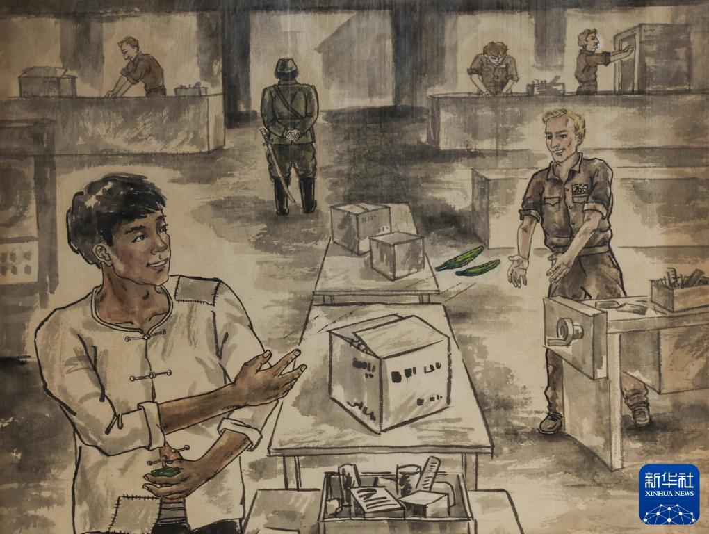 沈陽二戰盟軍戰俘營舊址陳列館內展出的繪畫作品(翻拍照片)。