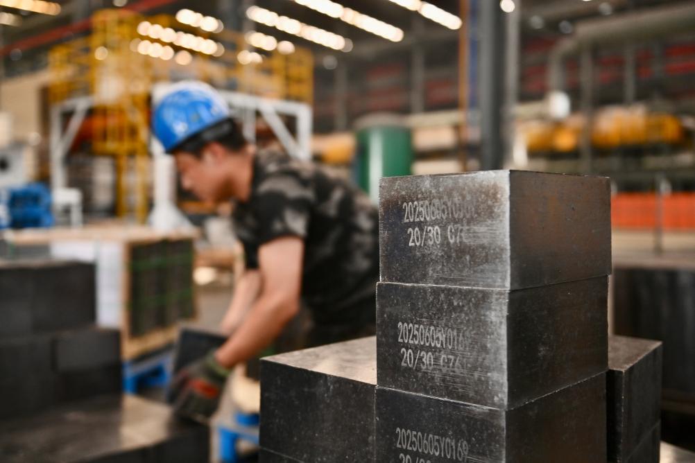 6月6日,工人在海城利爾麥格西塔材料有限公司搬運鋼包鎂碳磚。 新華社記者 吳青昊 攝
