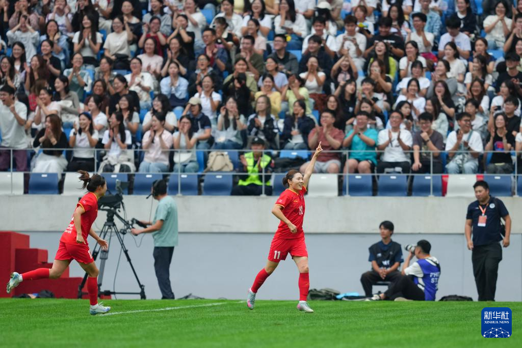 9月27日,上海體育大學女足球員尹麗紅(右二)進球后與隊友慶祝。新華社記者 鄭煥松 攝