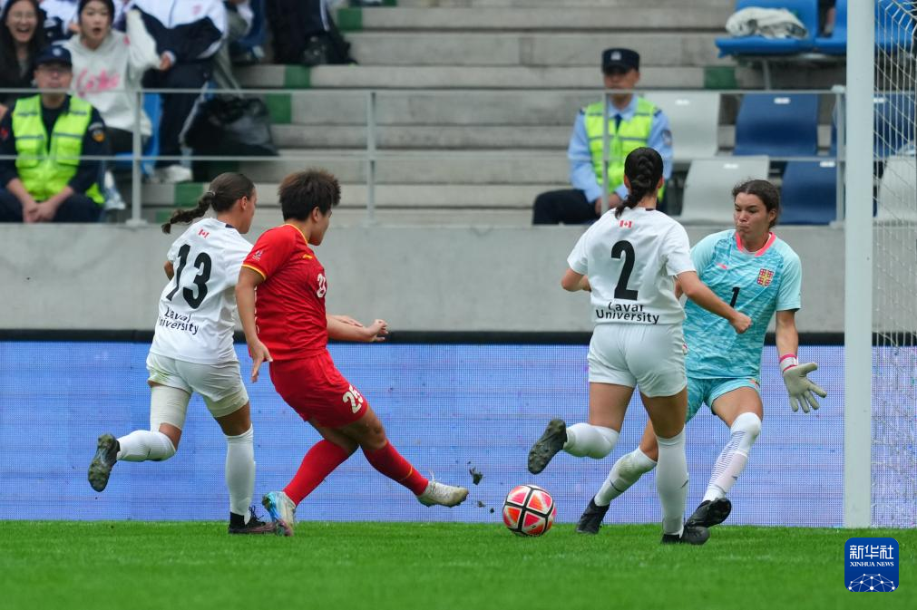 9月27日,拉瓦爾大學女足球員(中)在比賽中破門。新華社記者 鄭煥松 攝