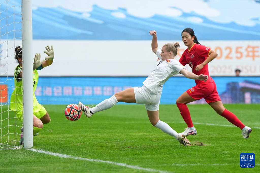 9月27日,上海體育大學女足球員尹麗紅(左二)在比賽中射門得分。新華社記者 鄭煥松 攝