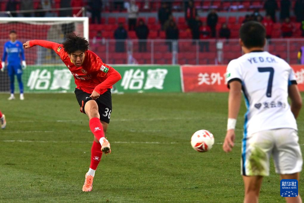 10月26日,遼寧鐵人隊球員田德澳(左)在比賽中射門。新華社記者 吳青昊 攝